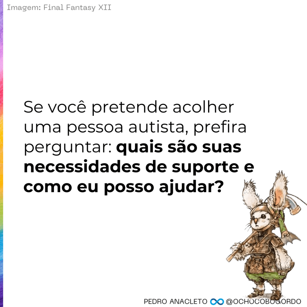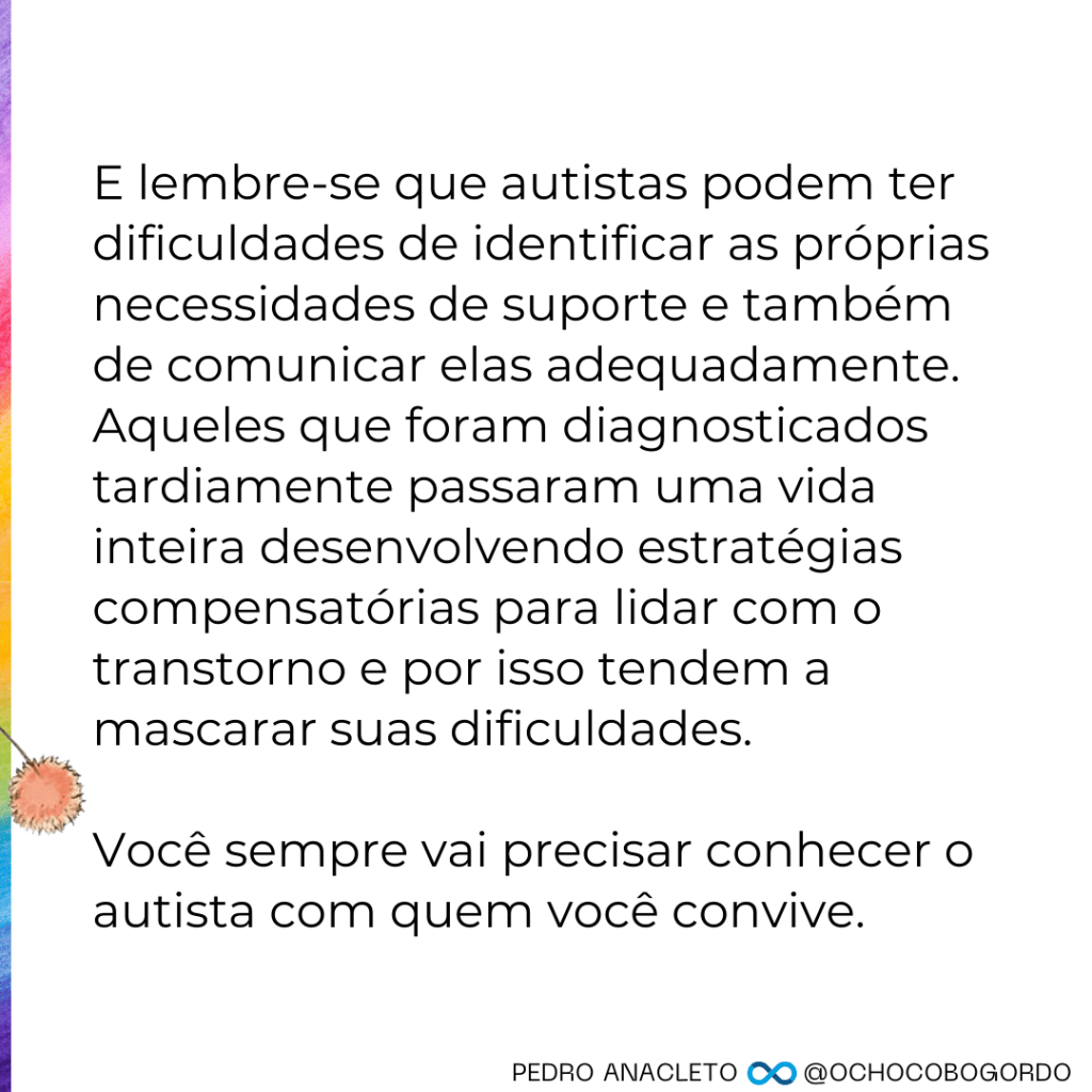 E lembre-se que autistas podem ter dificuldades de identificar as próprias necessidades de suporte e também de comunicar elas adequadamente. Aqueles que foram diagnosticados tardiamente passaram uma vida inteira desenvolvendo estratégias compensatórias para lidar com o transtorno e por isso tendem a mascarar suas dificuldades.