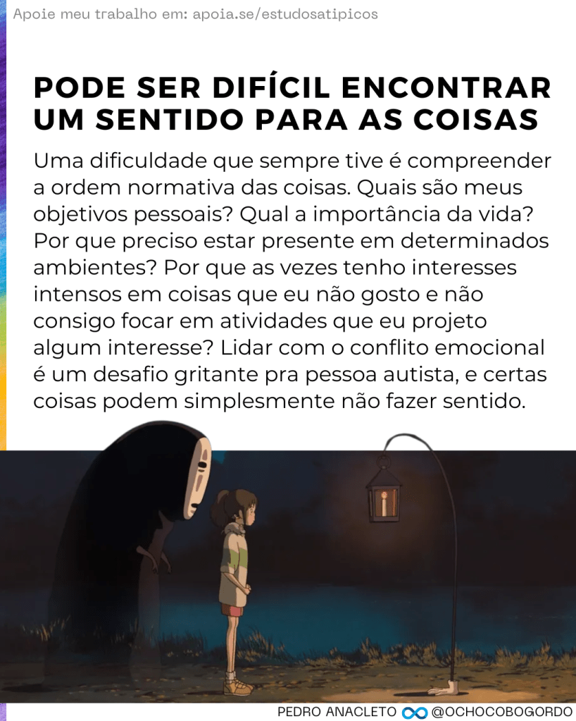 Uma dificuldade que sempre tive é compreender a ordem normativa das coisas. Quais são meus objetivos pessoais? Qual a importância da vida? Por que preciso estar presente em determinados ambientes? Por que as vezes tenho interesses intensos em coisas que eu não gosto e não consigo focar em atividades que eu projeto algum interesse? Lidar com o conflito emocional é um desafio gritante pra pessoa autista, e certas coisas podem simplesmente não fazer sentido.