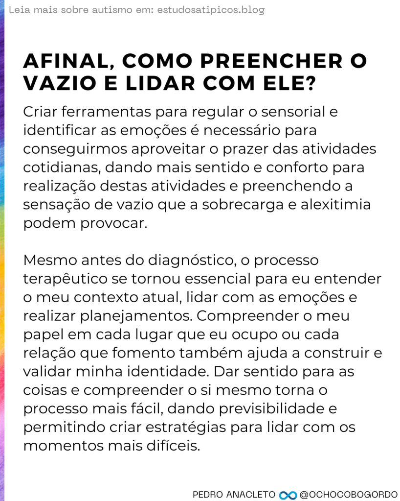 Criar ferramentas para regular o sensorial e identificar as emoções é necessário para conseguirmos aproveitar o prazer das atividades cotidianas, dando mais sentido e conforto para realização destas atividades e preenchendo a sensação de vazio que a sobrecarga e alexitimia podem provocar.