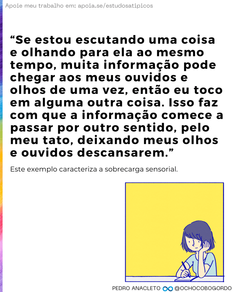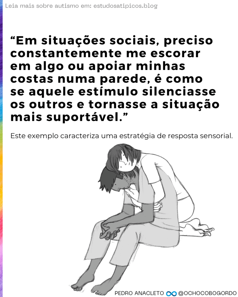 - “Em situações sociais, preciso constantemente me escorar em algo ou apoiar minhas costas numa parede, é como se aquele estímulo silenciasse os outros e torna a situação mais suportável.”