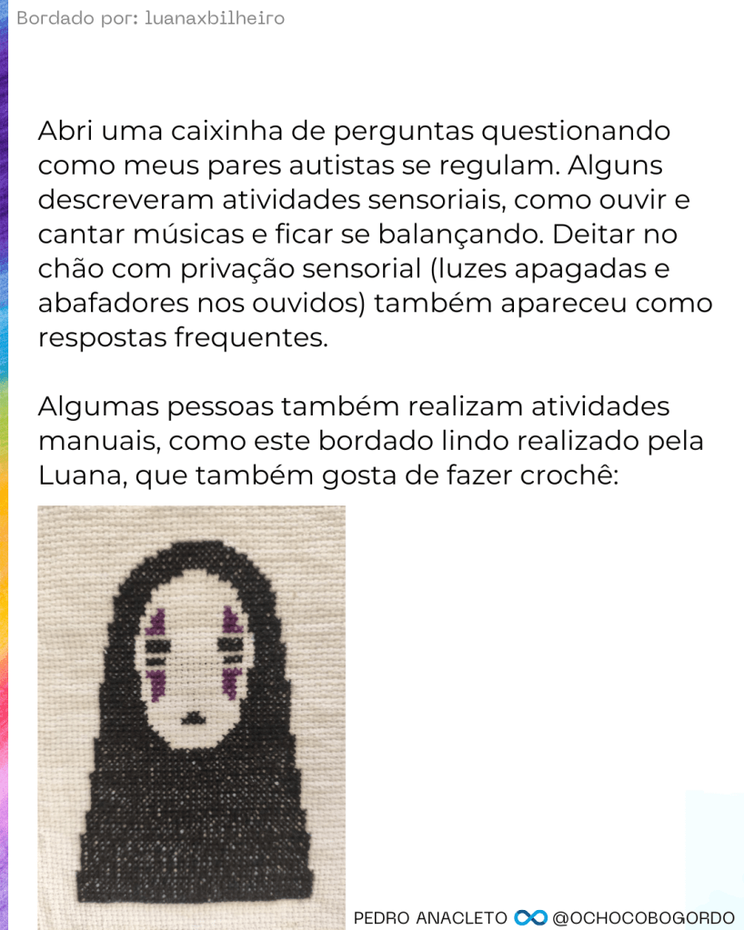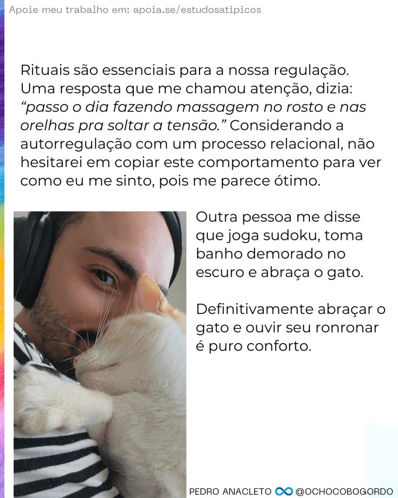 Uma característica que marca o Transtorno do Espectro Autista é a dificuldade nos processos de autorregulação emocional. O autismo é marcado por isso: uma compreensão atípica de como percebemos o mundo devido às nossas alterações sensoriais e tentativas frustradas de se regular. Com essa dificuldade, os nossos sistemas entram em crise e podemos nos sentir culpados, pois não tivemos a oportunidade de aprender a lidar com as emoções e comunicar adequadamente o que estamos sentindo, sobretudo quando o diagnóstico é tardio.